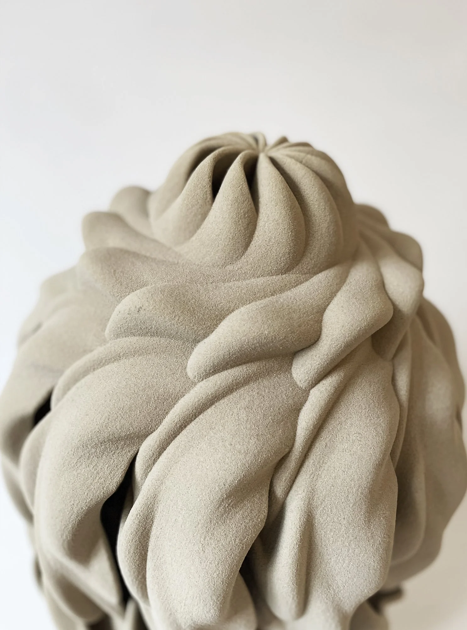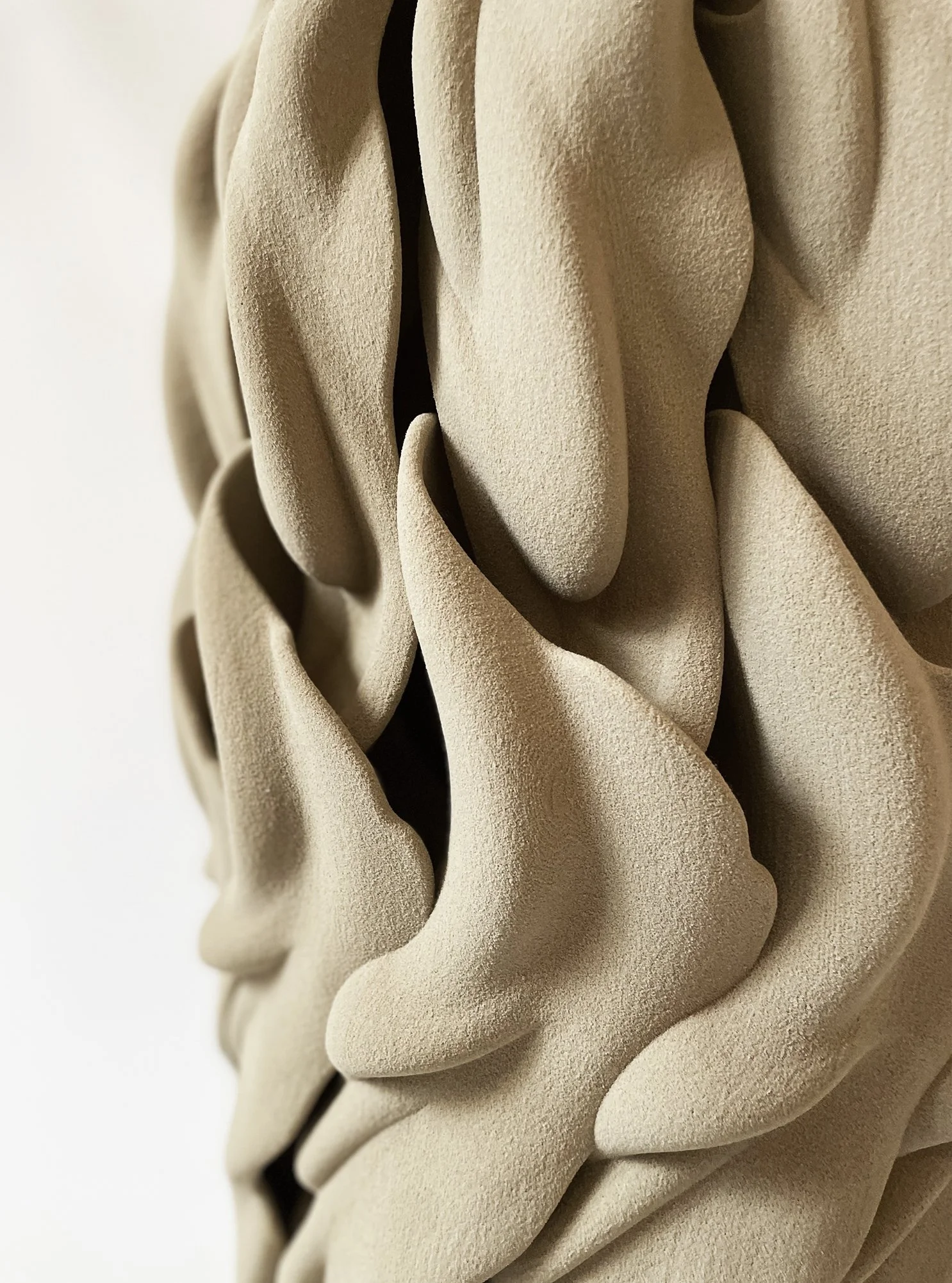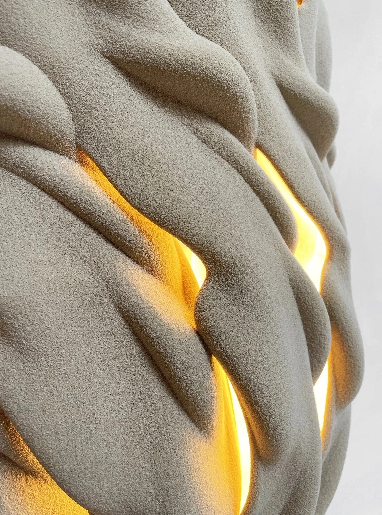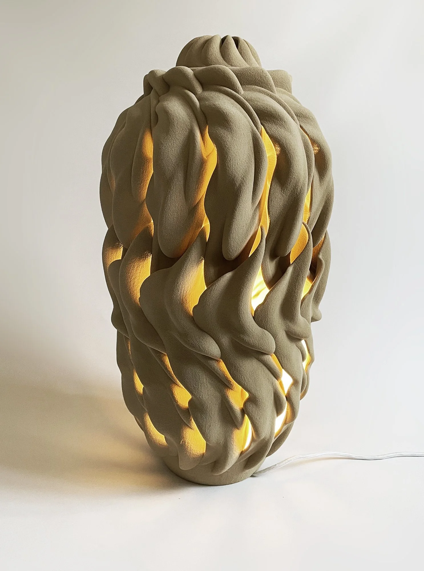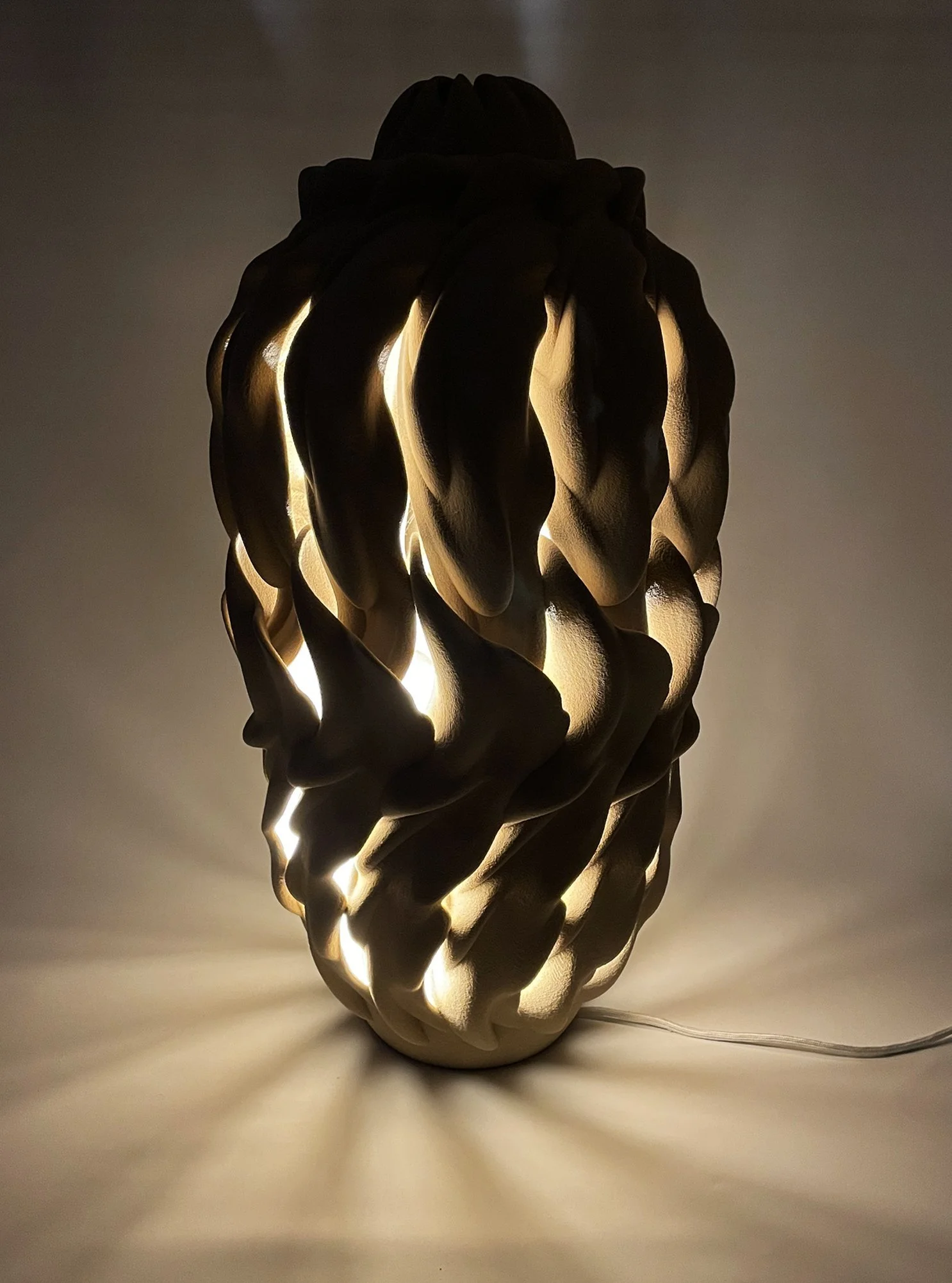 The design consists of 12 identical components, each featuring a lower and upper section that rotate in a circular pattern. This configuration accommodates a light bulb. The intricate and fluid geometry interacts with the light, creating an effect reminiscent of a bonfire. The lamp evokes qualities similar to a bonfire, offering a soothing and calming visual experience.