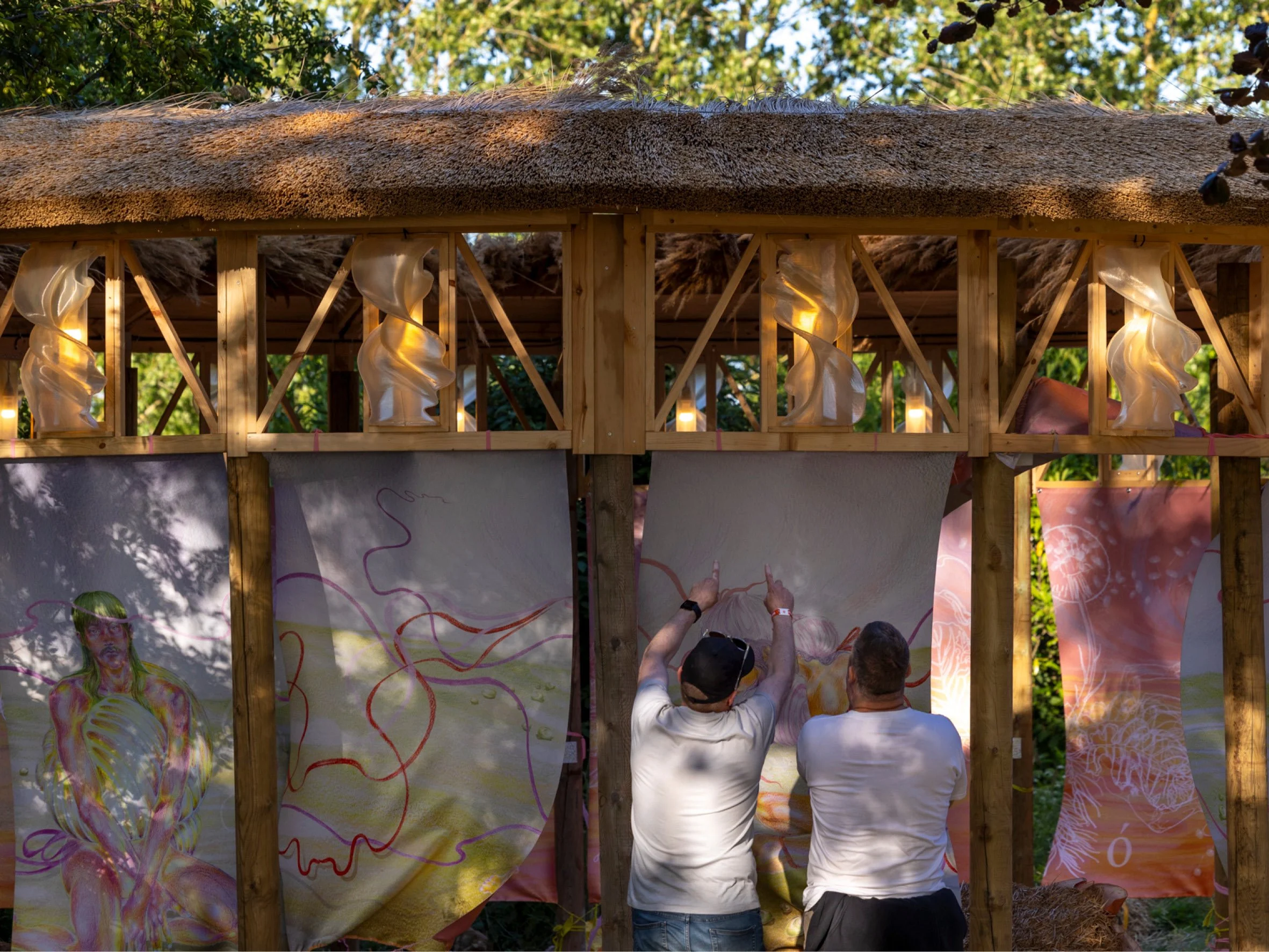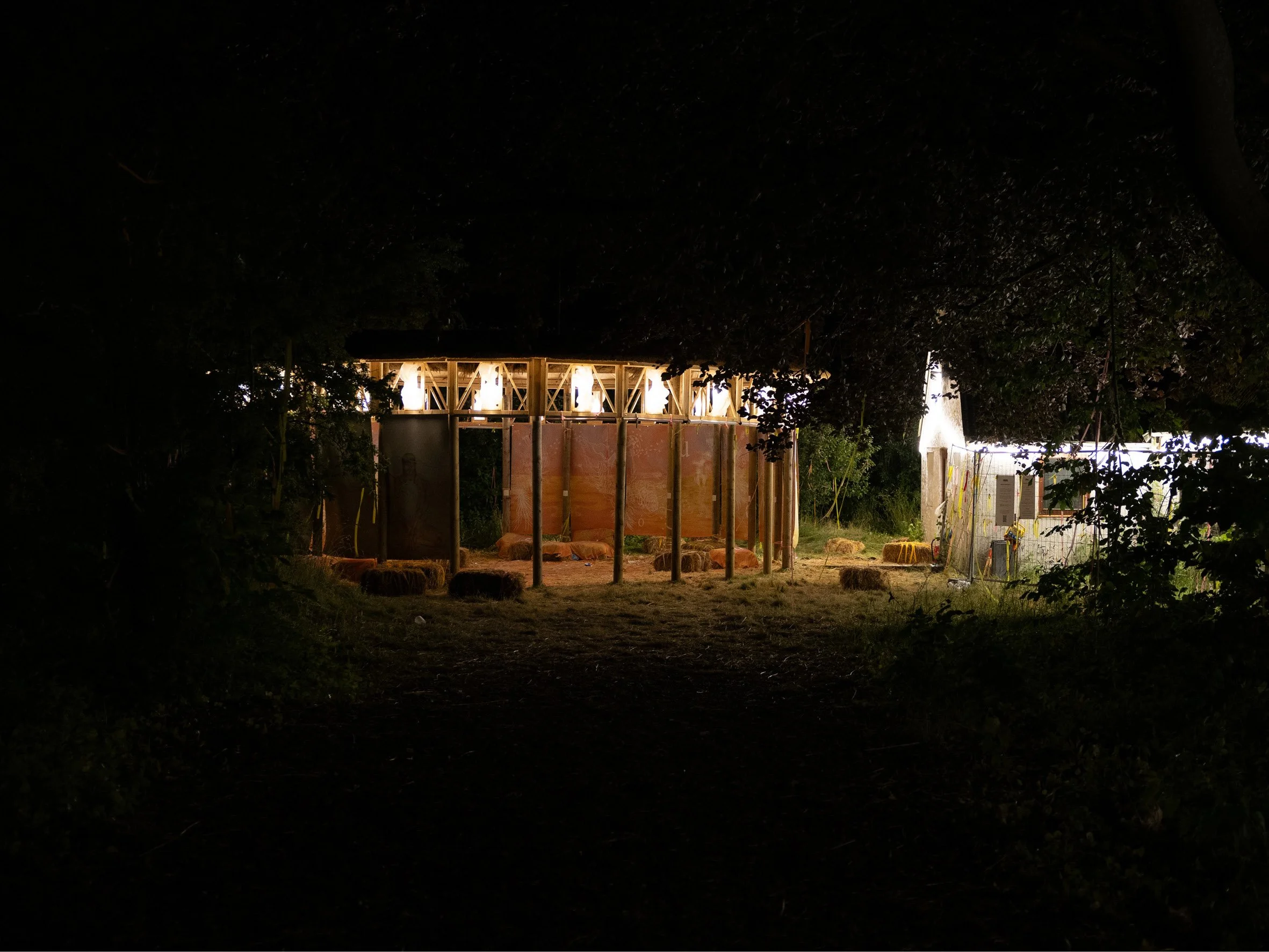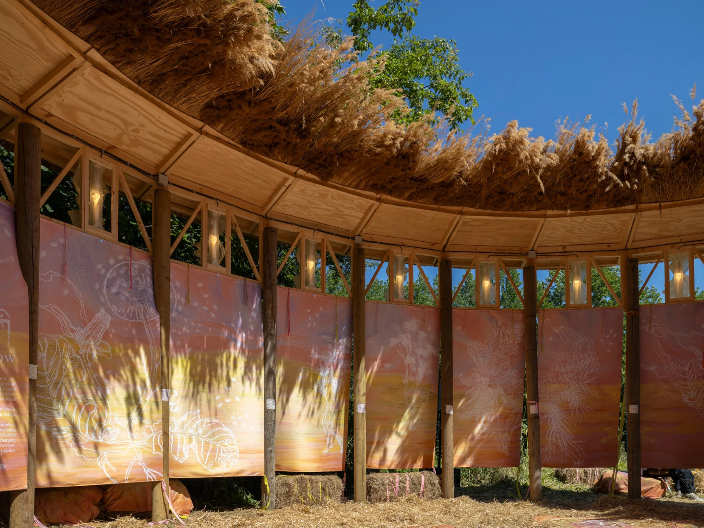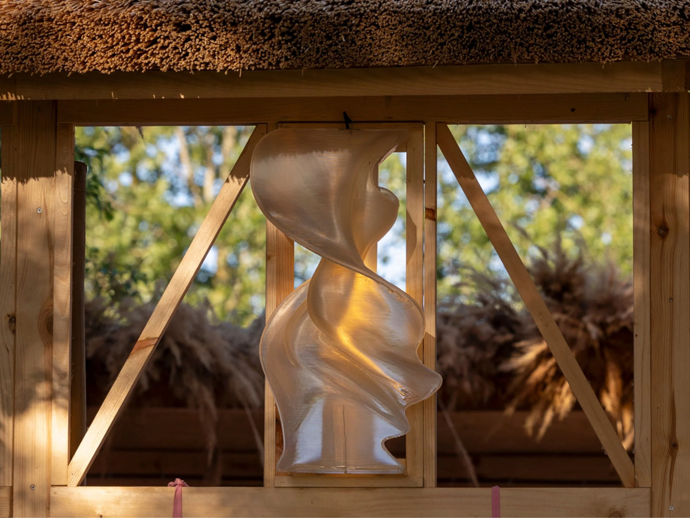 Constructed in timber and thatch, the pavilion integrates 3D-printed lighting elements directly into the architectural framework. Digital fabrication is used not as an aesthetic gesture, but as a method for testing how light, structure and material can be developed as a single system. The lighting is embedded within the structure, allowing illumination to emerge from the architecture itself rather than being added afterwards.