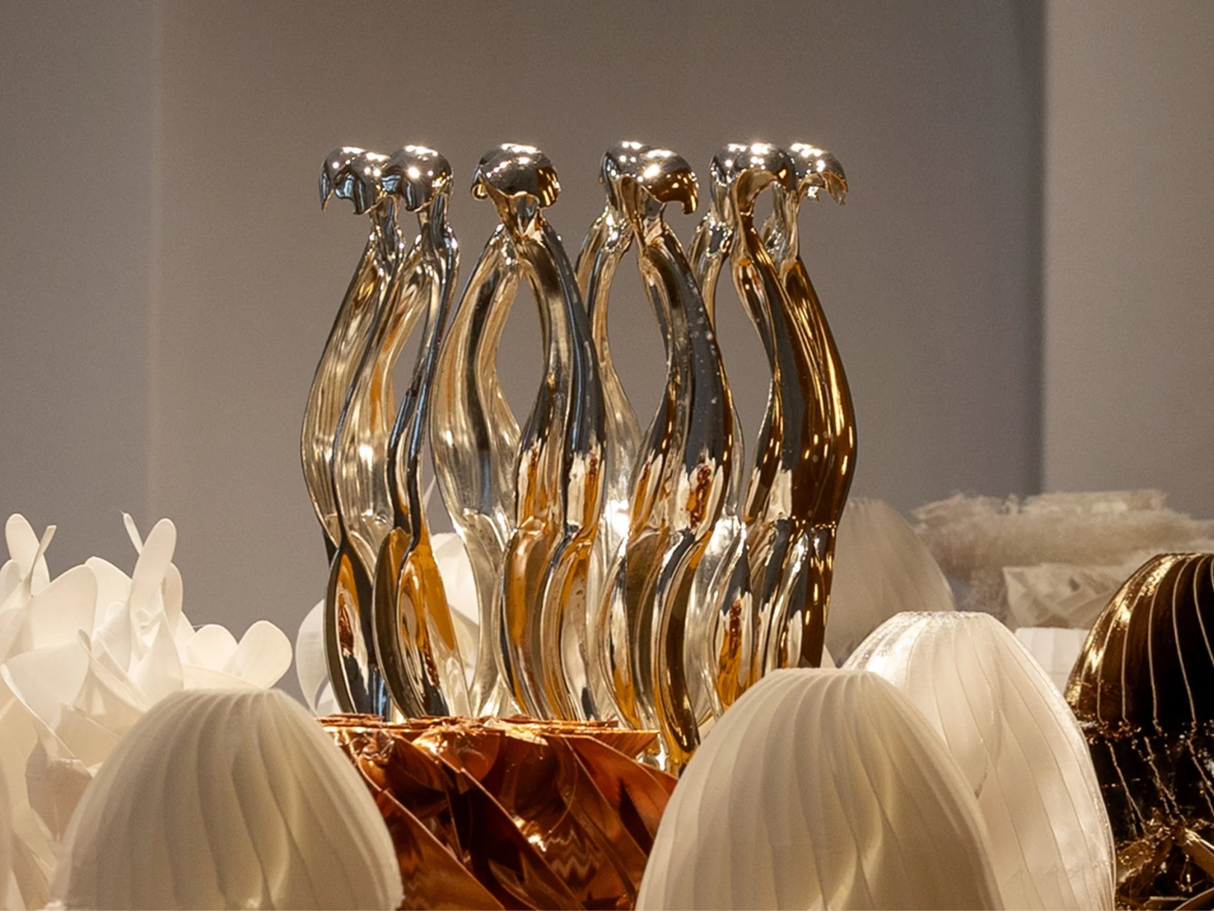 The piece is produced using large-scale 3D printing in recycled bioplastic, allowing the layered surface to remain visible as an integral part of the expression. Rather than hiding the production process, the striated texture records time, movement, and material behaviour, turning fabrication into ornament.